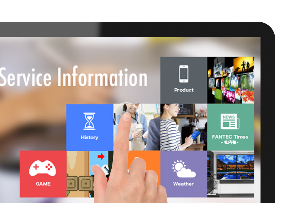 サイネージの中でも、タッチパネルに対応したものは、抜群の注目度と集客性を持っています。iPadなどの小型のものから、42インチなど大型のタッチパネルタブレットまで、シチュエーションに会った機材とコンテンツを企画、制作しています。